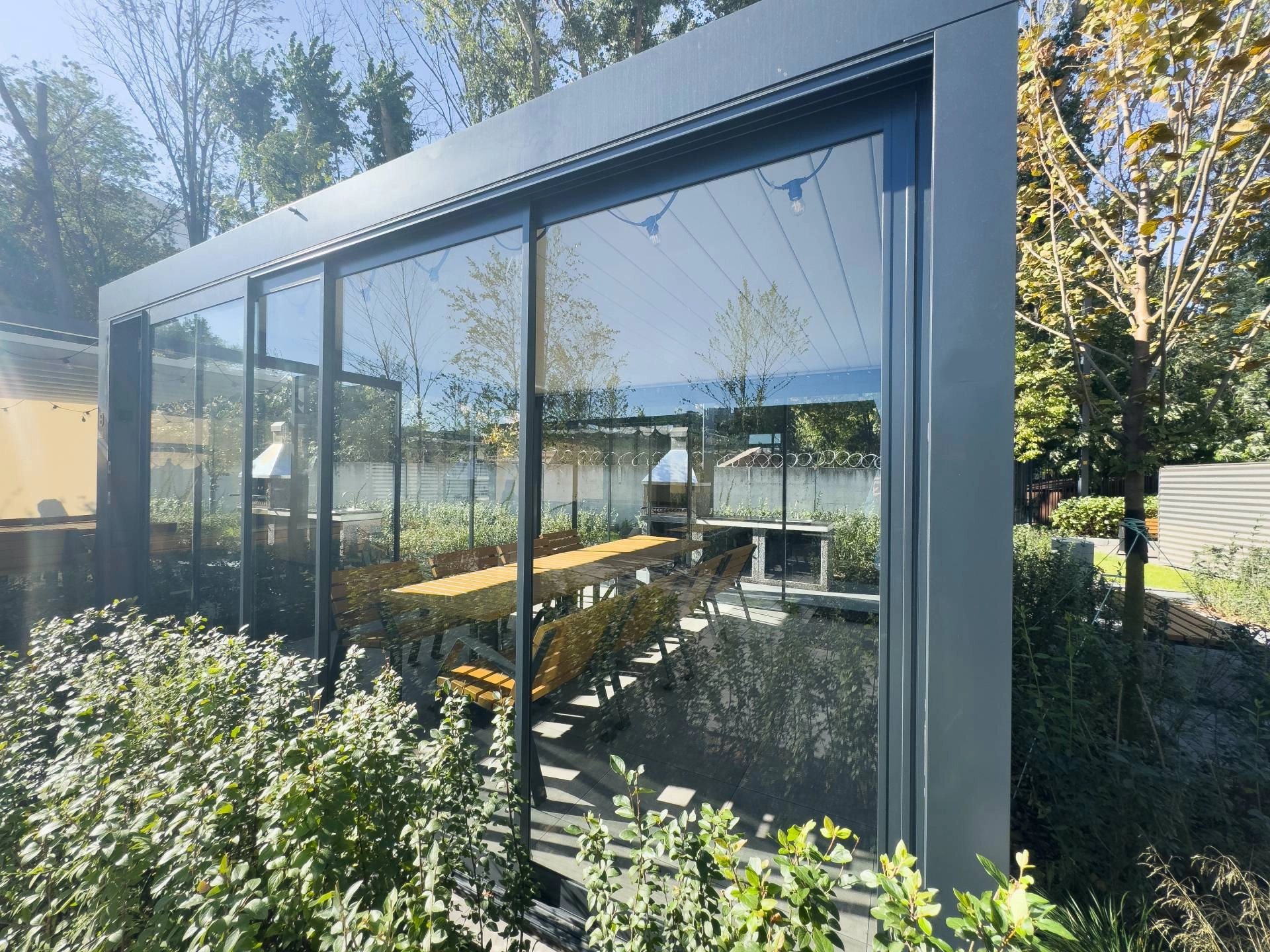 An enclosed patio is a space attached to a home or business that is separated from the outdoors with either screens or glass and is at ground level. For homes, this might be a space approximately the size of a living room. For businesses, this space can vary in size and often serves as additional seating when the weather is nice.
